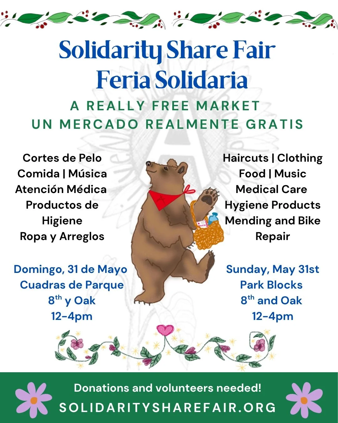 The next Solidarity Share Fair will be on Sunday, May 31st from noon - 4pm. This is an entirely free market where you can get haircuts, clothing, medical care, hygiene products, mending, and bike repair. There will also be food and music to enjoy. I will be offering free 15 minute chair massages. Come on down early to get the services and products you need!